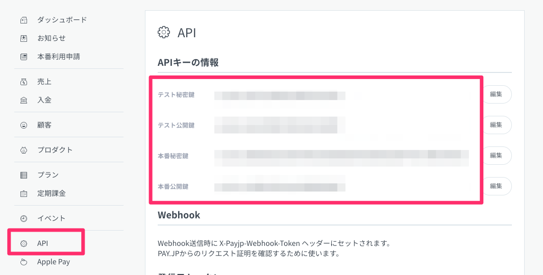 - PAY.JPの管理画面で [API] からAPIキーの情報を確認します。